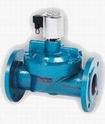 本阀通径15~100为膜片式为二次开阀的先导式电磁阀,通径125~300为三次开阀的先导式电磁阀,其结构主要由副阀和主阀组成。根据断电时所处开关状态的不同,可分为常闭电磁阀和常开电磁阀。常闭电磁阀,常位时,活动铁芯封住副阀口,阀腔内压力平衡,副阀、主阀口封闭。当线圈通电,产生电磁力:将活动铁芯吸上,副阀打开,主阀腔内的介质自导阀门外世,以致主阀阀杯上下产生压力差,膜片或阀杯被迅速托起主阀口开启,阀呈通路状态。