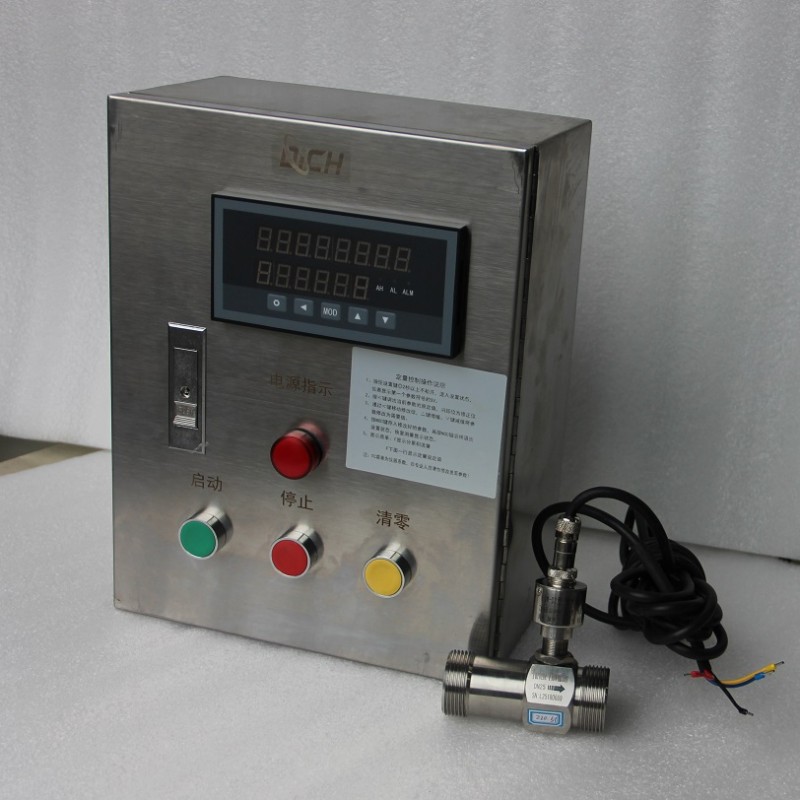 定量控制仪在接收了流量计的流量信号后,在其内部完成流量的累计,同时在控制仪内部设定好所需要的定量控制值,当定量控制仪显示的累计数值达到所设定的定量控制值时,定量控制仪输出开关量信号。此时利用该开关信号通过配接继电器或接触器来控制安装在管道上的断流设备,从而达到定量控制的效果。